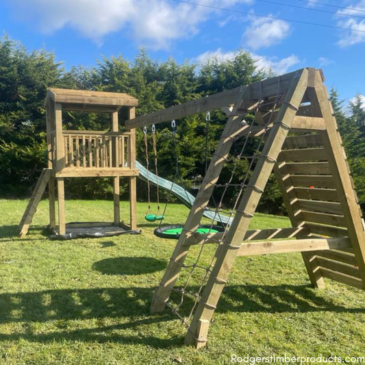 This Tower swing set includes a nest swing, rock climber, and rope climber for endless outdoor fun.